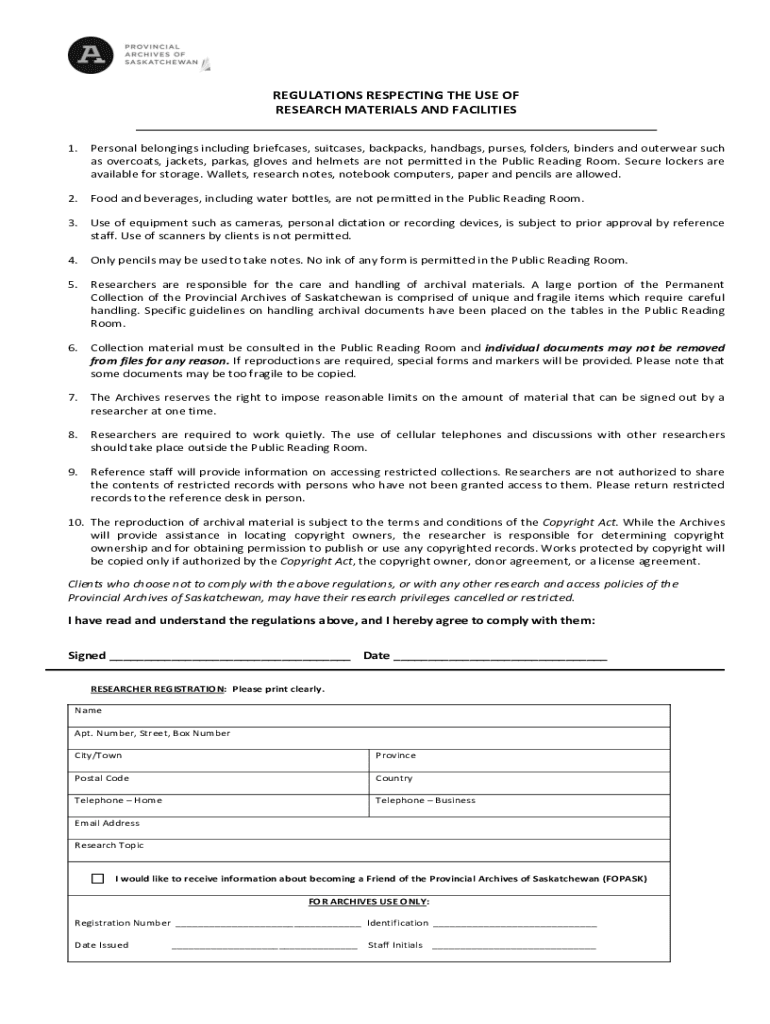 REGULATIONS RESPECTING THE USE OF RESEARCH MATERIALS AND FACILITIES 1. Personal belongings including briefcases, suitcases, backpacks, purses, purses, folders, binders and outerwear such as overcoats,
