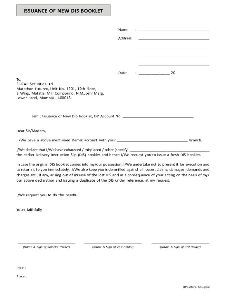 ISSUANCE OF NEW DIS BOOKLETName:Address :Date:: 20To, SB ICAP Securities Ltd. Marathon Future, Unit No. 1201, 12th Floor, B Wing, Mazatlan Mill Compound, N.M. Joshi Mary, Lower Pearl, Mumbai 400013.