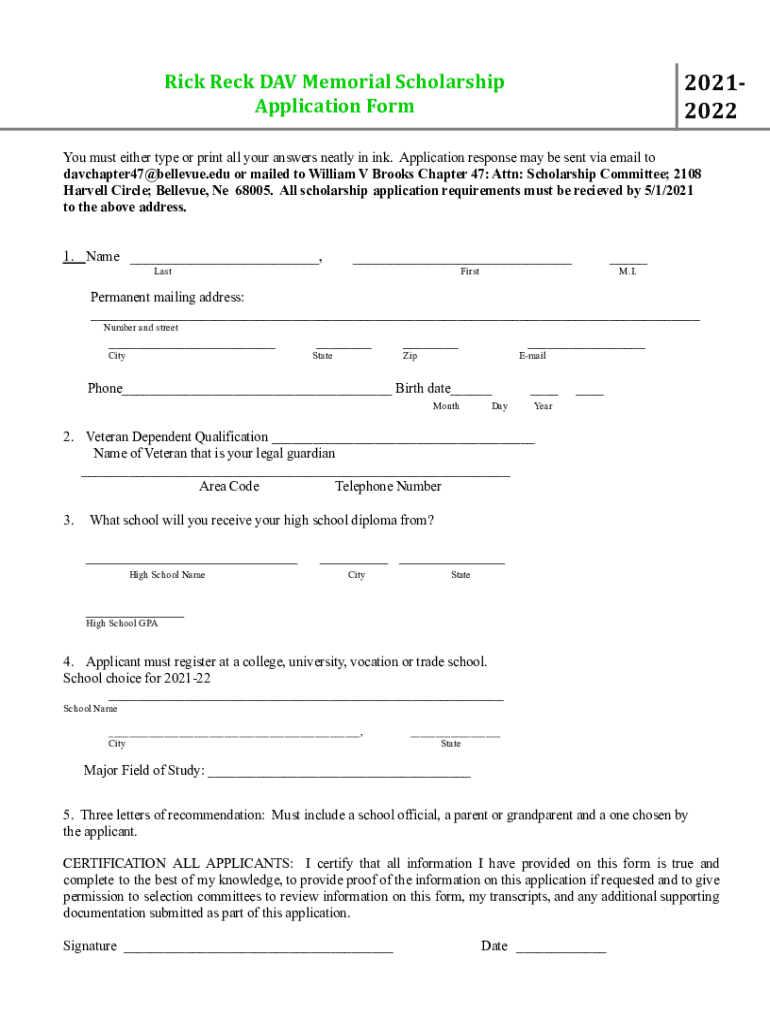 Rick Rock DAV Memorial Scholarship Application Form20212022You must either type or print all your answers neatly in ink. Application response may be sent via email to davchapter47 Bellevue.edu or