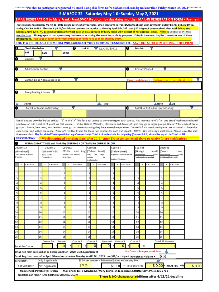 *********Patches to participants registered by email using this form to frankdvoa@aol.com by no later than Friday, March 26, 2021**********SMA SOC 32 Saturday, May 1 0r Sunday, May 2, 2021EMAIL REGISTRATION