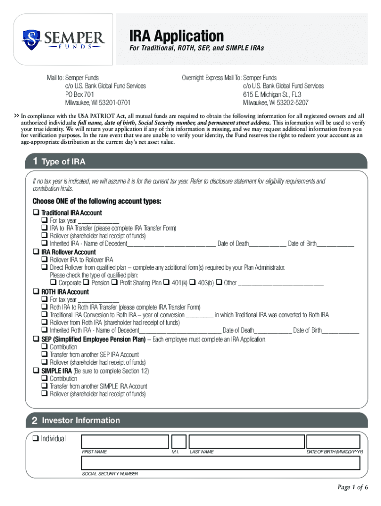 IRA Application Traditional, ROTH, SEP, and SIMPLE Ismail to: Temper Funds/o U.S. Bank Global Fund Services PO Box 701Milwaukee, WI 532010701Overnight Express Mail To: Temper Funds/o U.S. Bank Global