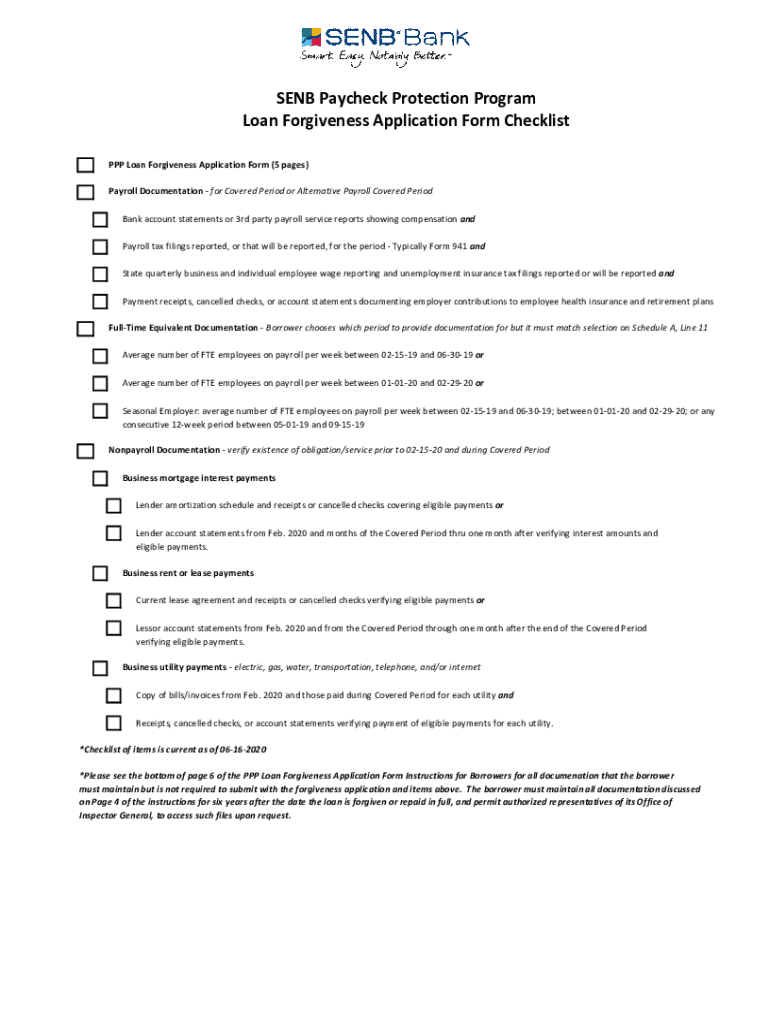 SENT Paycheck Protection Program Loan Forgiveness Application Form Checklist PPP Loan Forgiveness Application Form (5 pages) Payroll Documentation for Covered Period or Alternative Payroll Covered