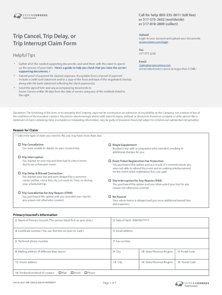 Call for help: 8003350611 (toll-free) or 3175752652 (worldwide) or 3178182809 (collect)Trip Cancel, Trip Delay, or Trip Interrupt Claim Formula Login to your account and upload your documents sevencorners.com/login