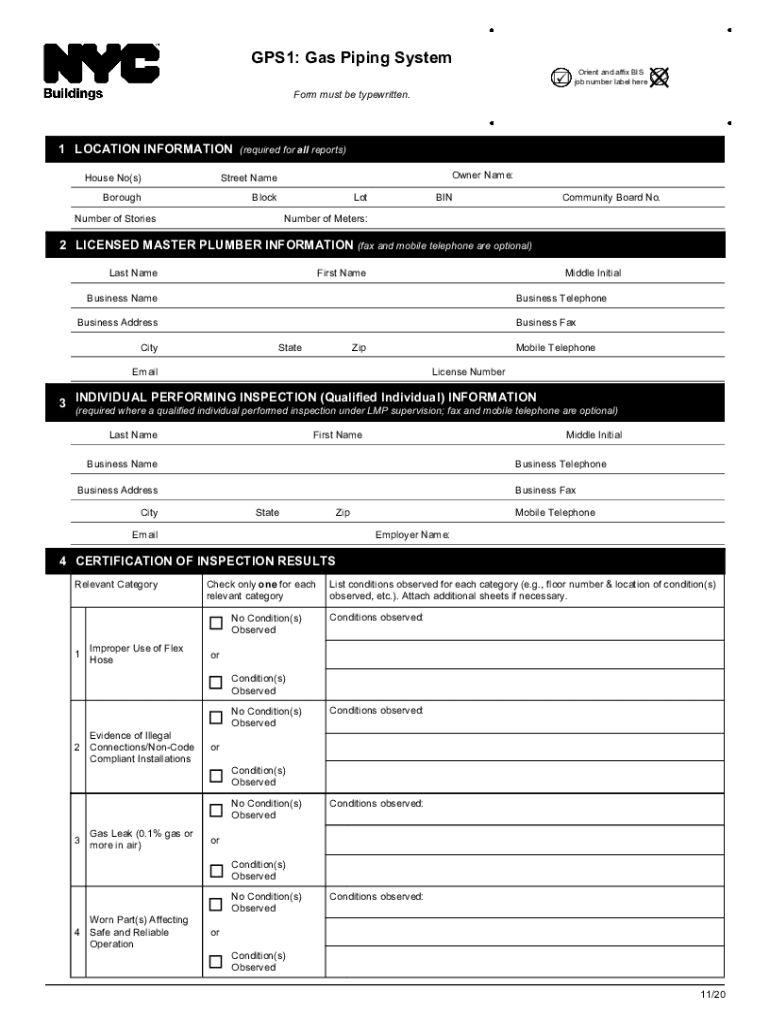 GPS1: Gas Piping System Orient and affix BIS job number label Hereford must be typewritten.1 LOCATION INFORMATION (required for all reports) House No(s)Street NameBoroughBlockOwner Name: Outnumber