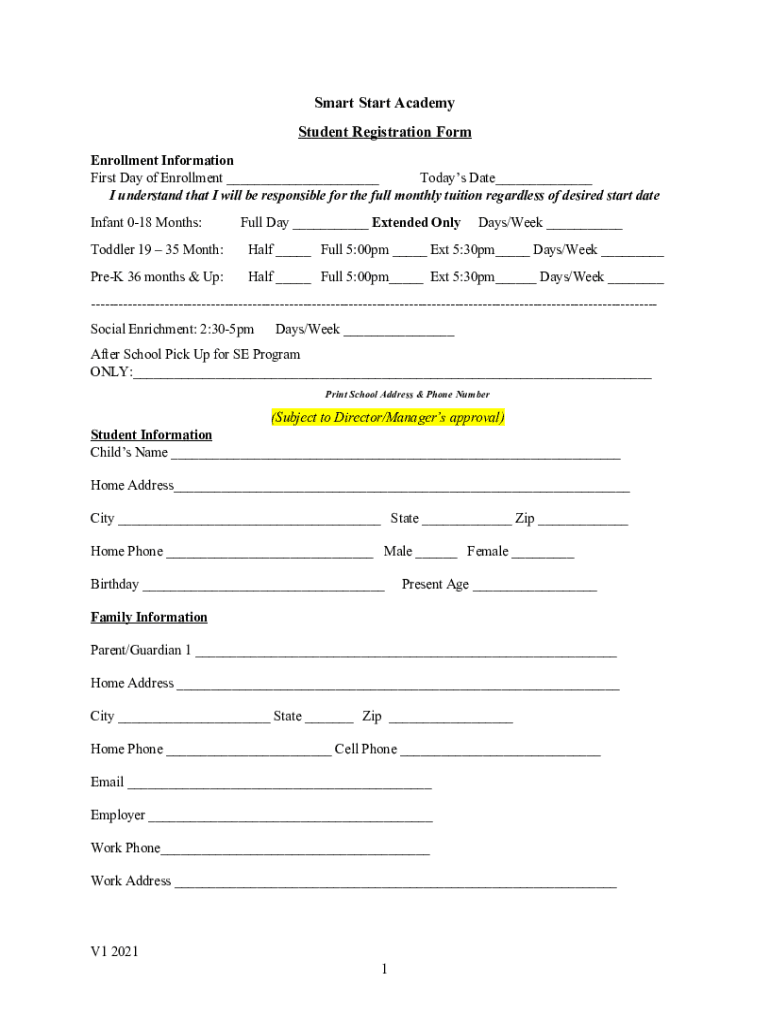 Smart Start Academy Student Registration Form Enrollment Information First Day of Enrollment Today's Date I understand that I will be responsible for the full monthly tuition regardless of desired