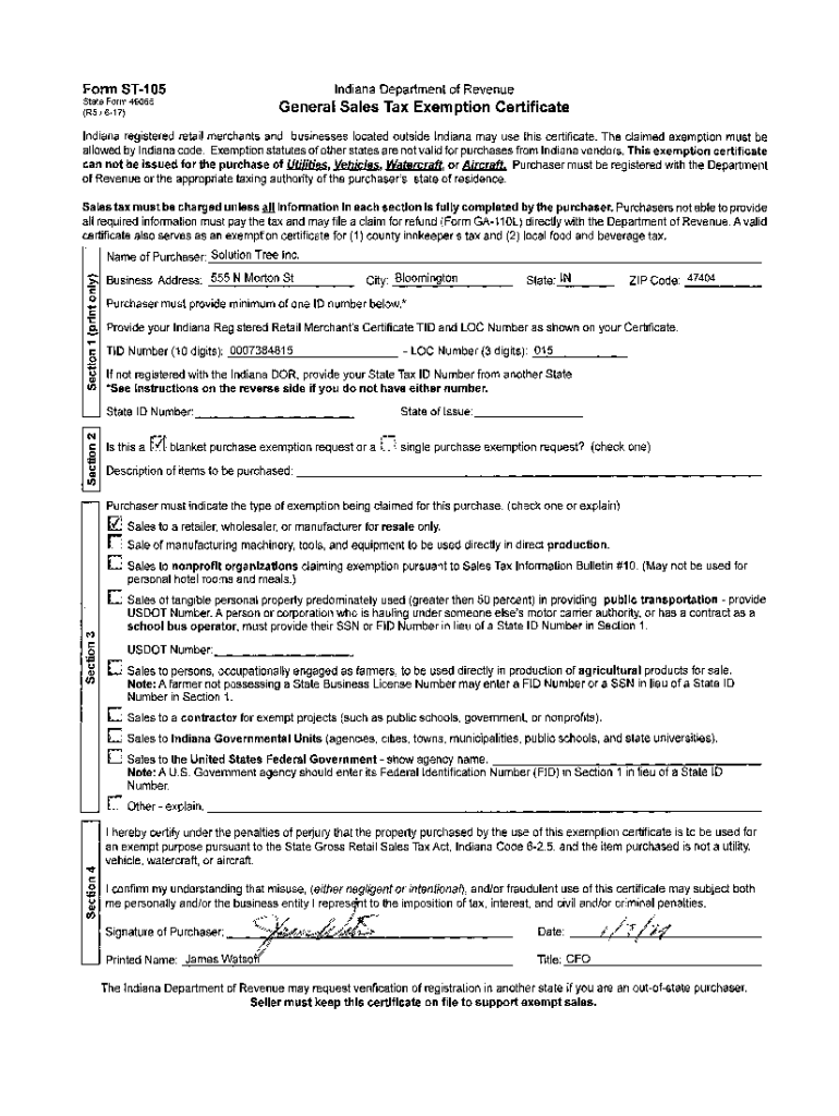 Form ST105 State Fond 49065 (RS/ 617)Indiana Department of RevenueGeneral Sales Tax Exemption Certificate Indiana registered retail merchants and businesses located outside Indiana may use this certificate.