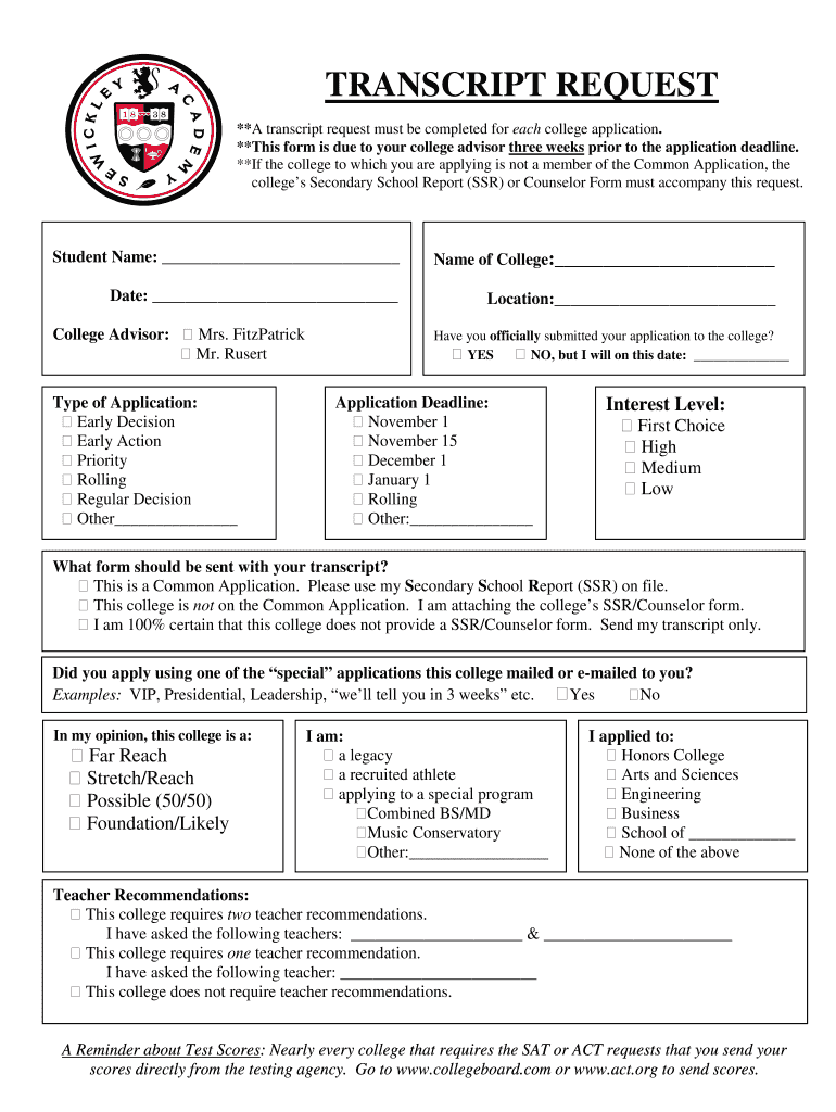 You should submit the Transcript Request Form at least three weeks prior to your college application deadline to ensure your transcripts are processed in time.