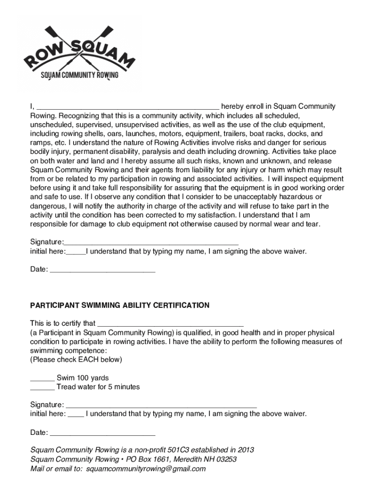 I, hereby enroll in Squad Community Rowing. Recognizing that this is a community activity, which includes all scheduled, unscheduled, supervised, unsupervised activities, as well as the use of the