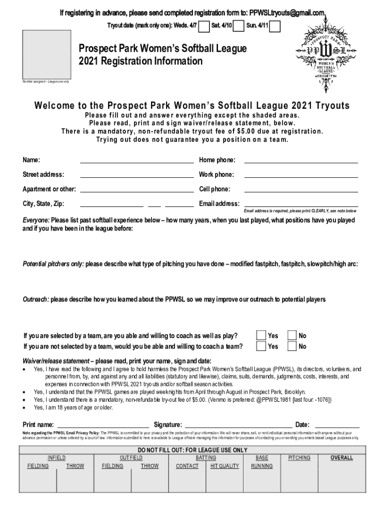 If registering in advance, please send completed registration form to: PPWSLtryouts@gmail.com. Tryout date (mark only one): Weds. 4/7Sat. 4/10Sun. 4/11Prospect Park Women's Softball League 2021 Registration