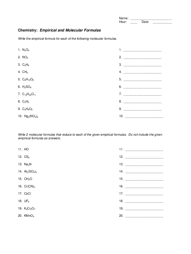Students in chemistry classes or professionals in analytical chemistry may be required to fill out empirical formula worksheet answers.