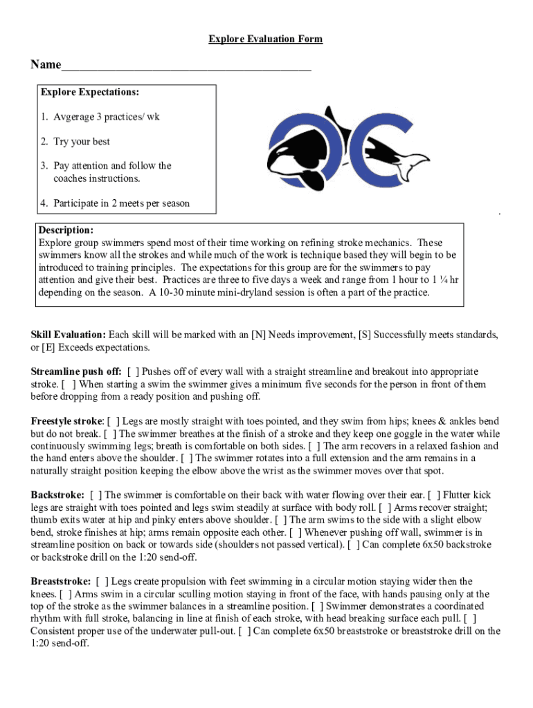 Explore Evaluation Forename Explore Expectations: 1. Average 3 practices/ wk 2. Try your best 3. Pay attention and follow the coaches instructions. 4. Participate in 2 meets per season. Description: