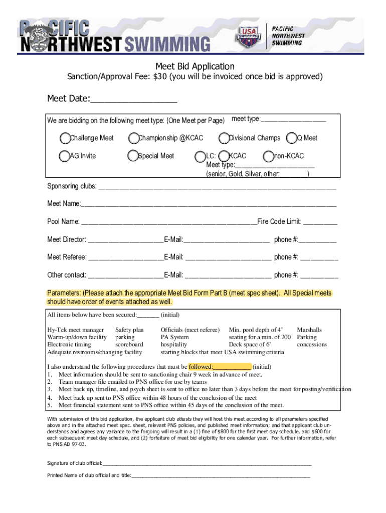 Get the free SWIM MEET BID NOTES The Bid Form can be printed and ...