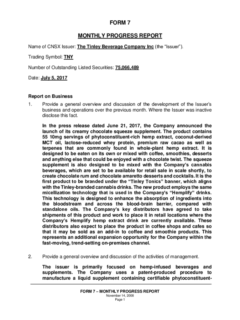 FORM 7 MONTHLY PROGRESS REPORT Name of CNS Issuer: The Finley Beverage Company Inc (the Issuer). Trading Symbol: ANY Number of Outstanding Listed Securities: 75,066,489 Date: July 5, 2017Report on