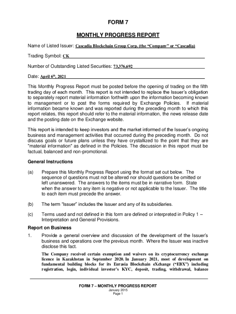 FORM 7 MONTHLY PROGRESS REPORT Name of Listed Issuer: Cascadia Blockchain Group Corp. (the Company or Cascadia) Trading Symbol: CK Number of Outstanding Listed Securities: 73,376,692 Date: April 6th,