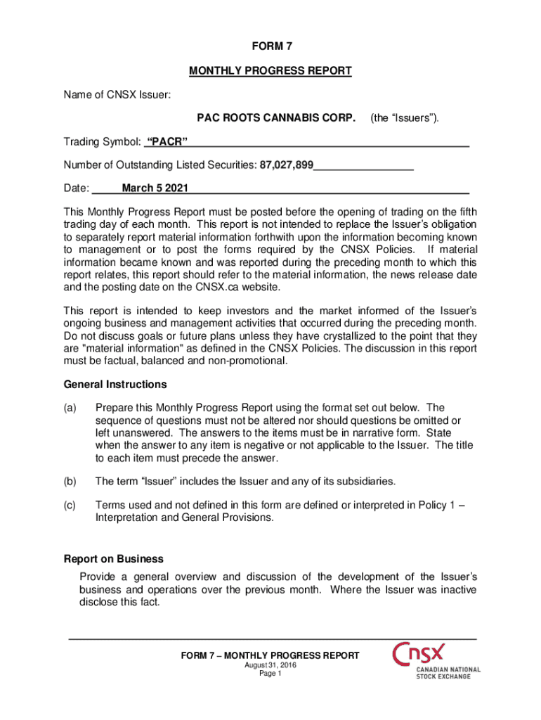 FORM 7 MONTHLY PROGRESS REPORT Name of CNS Issuer: PAC ROOTS CANNABIS CORP.(the Issuers). Trading Symbol: PAIR Number of Outstanding Listed Securities: 87,027,899 Date:March 5 2021This Monthly Progress