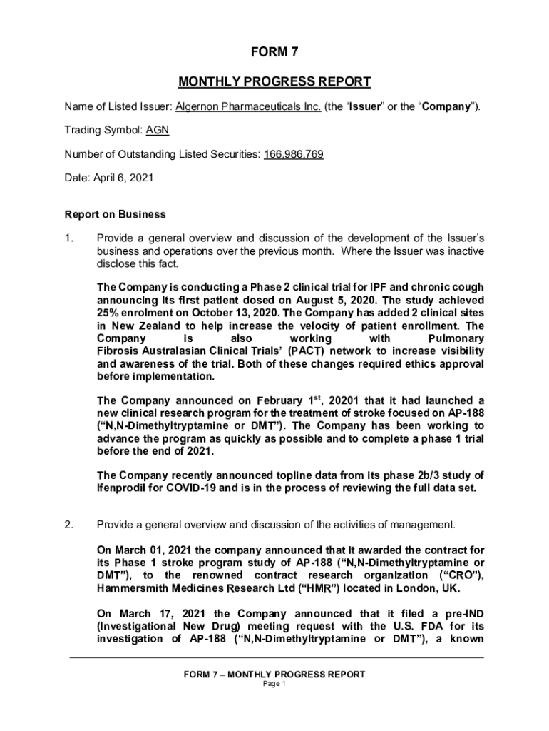 Get the free Algernon Form 7 Monthly report dated April 6 - Stockhouse