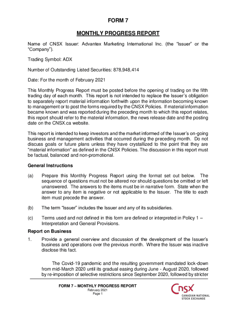 FORM 7 MONTHLY PROGRESS REPORT Name of CNS Issuer: Advance Marketing International Inc. (the Issuer or the Company). Trading Symbol: ADX Number of Outstanding Listed Securities: 878,948,414 Date: