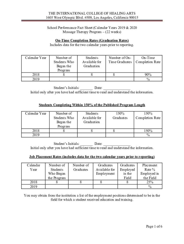 THE INTERNATIONAL COLLEGE OF HEALING ARTS 1605 West Olympic Blvd. #509, Los Angeles, California 90015 School Performance Fact Sheet (Calendar Years 2019 & 2020 Massage Therapy Program (22 weeks) Onetime