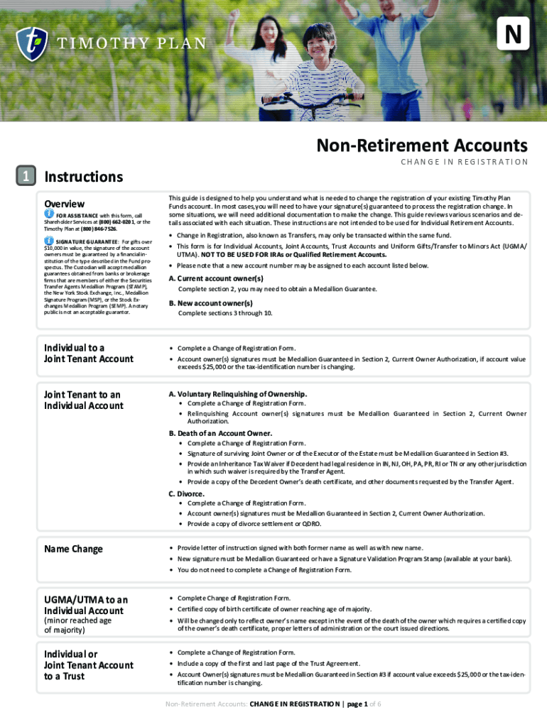 NNonRetirement Accounts CHANGE IN REGISTRATION1 Instructions Overview ASSISTANCE with this form, call Shareholder Services at (800) 6620201, or the Timothy Plan at (800) 8467526.SIGNATURE GUARANTEE: