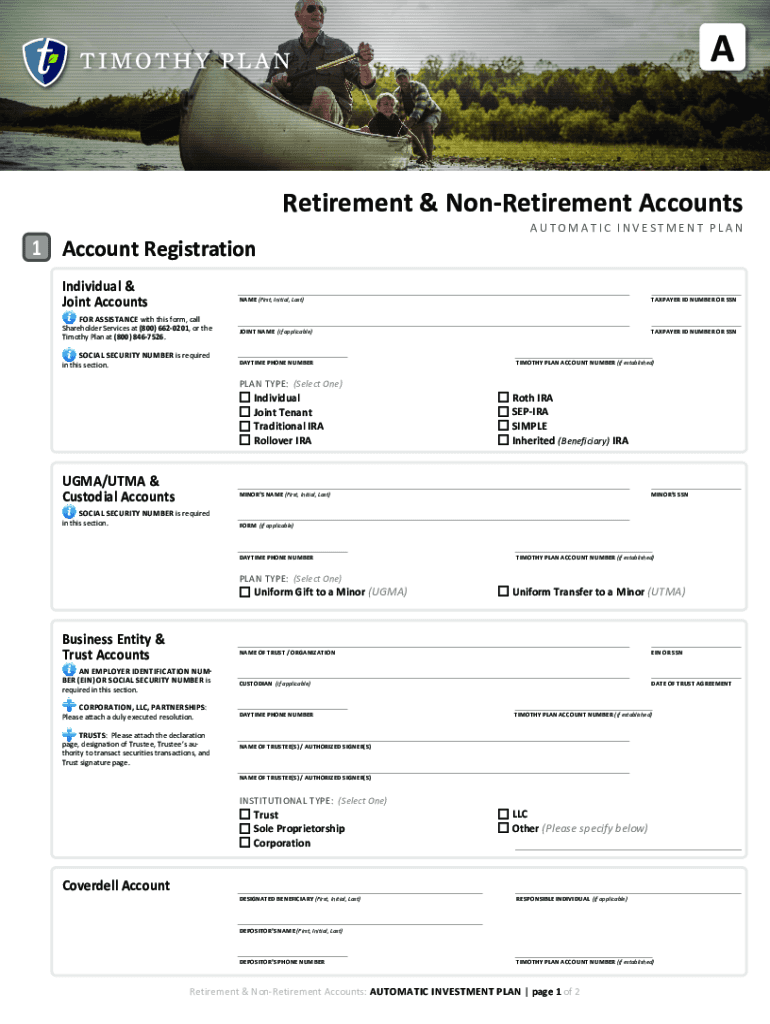 Retirement & Retirement Accounts AUTOMATIC INVESTMENT PLAN1 Account Registration Individual & Joint Accounts ASSISTANCE with this form, call Shareholder Services at (800) 6620201, or the Timothy Plan