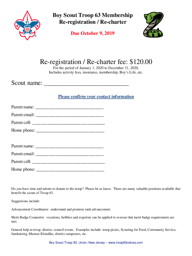 Boy Scout Troop 63 Membership Preregistration / Recharter Due October 9, 2019Reregistration / Recharter fee: $120.00 For the period of January 1, 2020, to December 31, 2020, Includes activity fees,