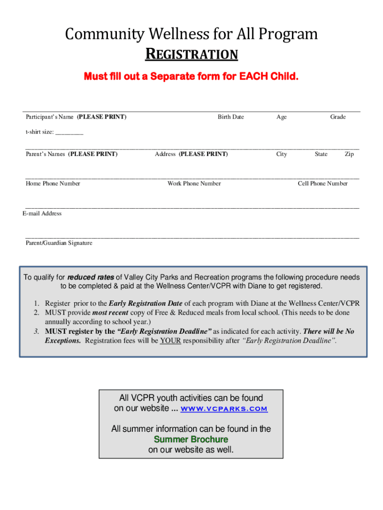 Community Wellness for All Program REGISTRATION Must fill out a Separate form for EACH Child. Participants Name (PLEASE PRINT)Birth DateAgeGradetshirt size: Parents Names (PLEASE PRINT) Address (PLEASE