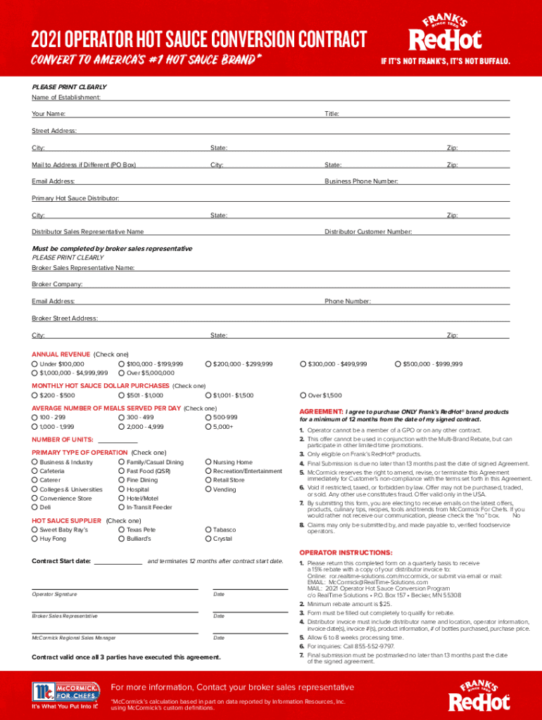 2021 OPERATOR HOT SAUCE CONVERSION CONTRACTCONVERT TO AMERICA\'S #1 HOT SAUCE BRAND×IF It's NOT FRANKS, It's NOT BUFFALO.PLEASE PRINT CLEARLY Name of Establishment: Your Name:Title:Street Address: