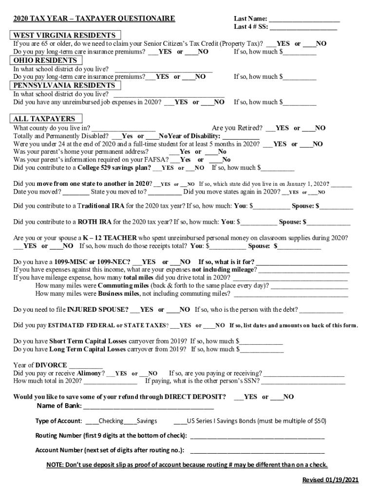 2020 TAX YEAR TAXPAYER QUESTIONAIRELast Name: Last 4 # SS: WEST VIRGINIA RESIDENTS If you are 65 or older, do we need to claim your Senior Citizens Tax Credit (Property Tax)? YES or NO Do you pay