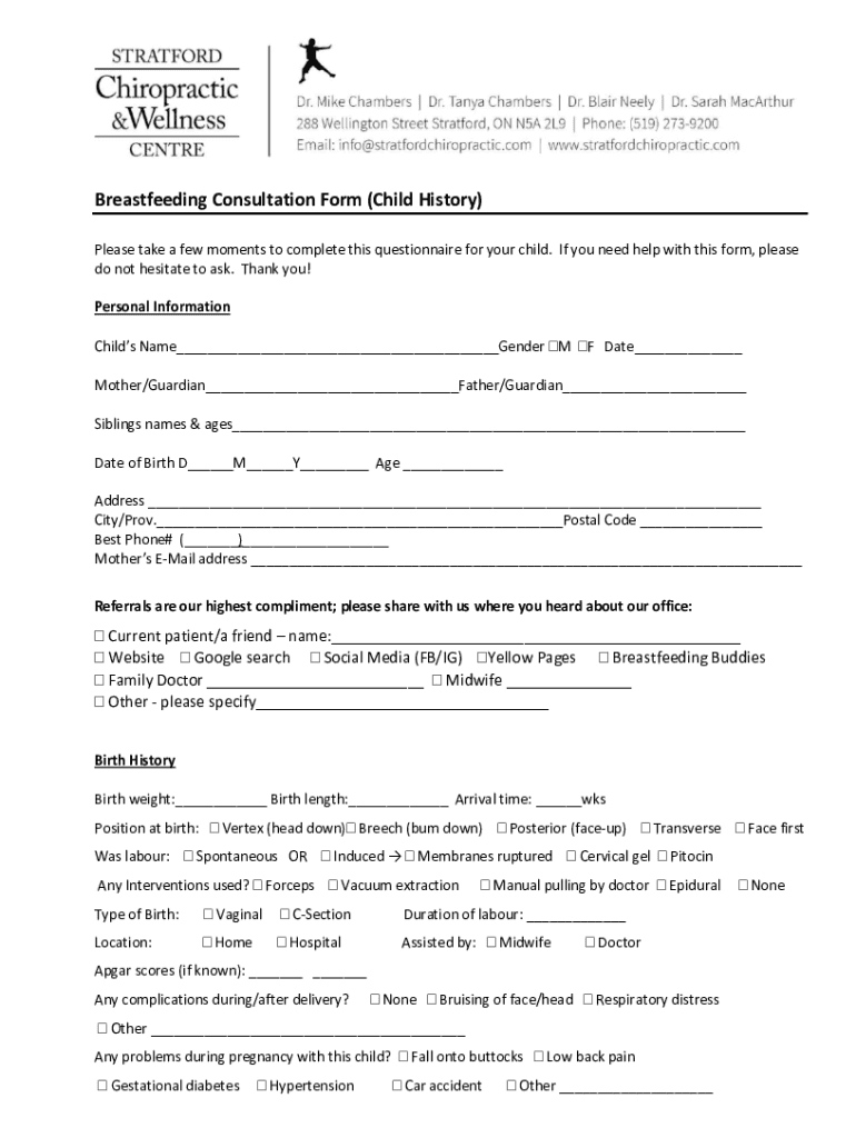 Breastfeeding Consultation Form (Child History) Please take a few moments to complete this questionnaire for your child. If you need help with this form, please do not hesitate to ask. Thank you!