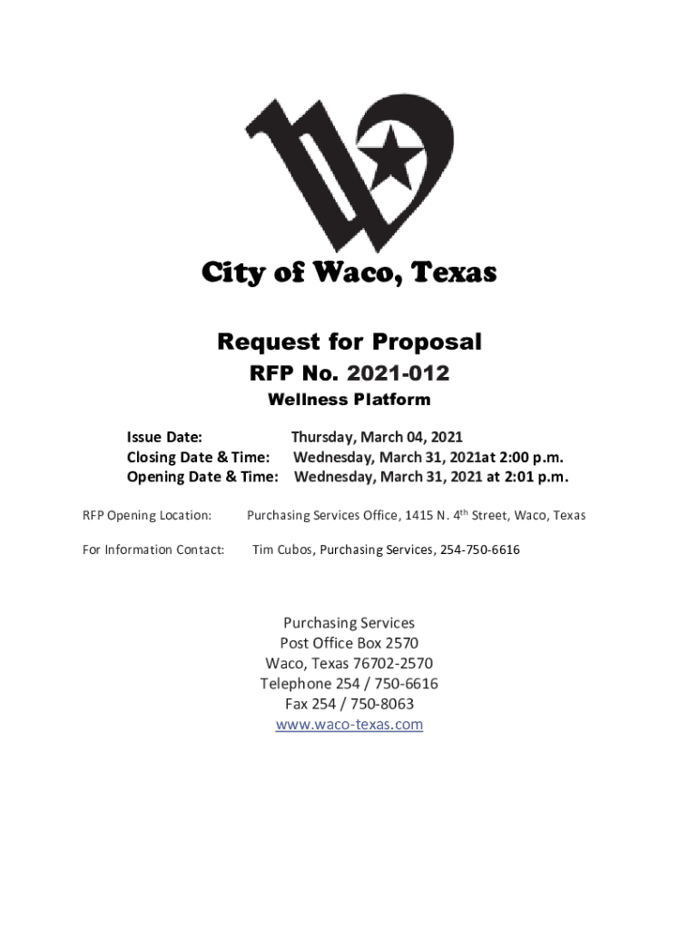City of Waco, Texas Request for Proposal RFP No. 2021012 Wellness Platform Issue Date:Thursday,March04,2021 ClosingDate&Time:Wednesday,March31,2021at2:00p.m. OpeningDate&Time:Wednesday,March31,2021at2:01p.m.