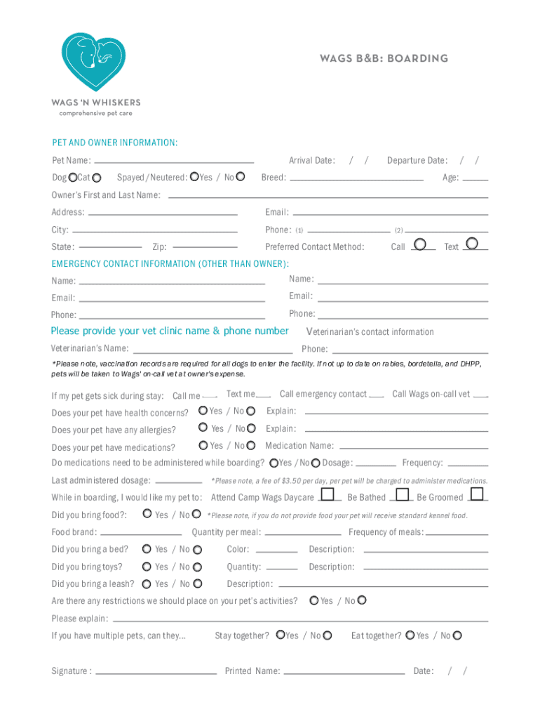 To fill out Wags B B Boarding paperwork, pet owners need to provide information about their pets, including medical history, dietary needs, and emergency contact information.