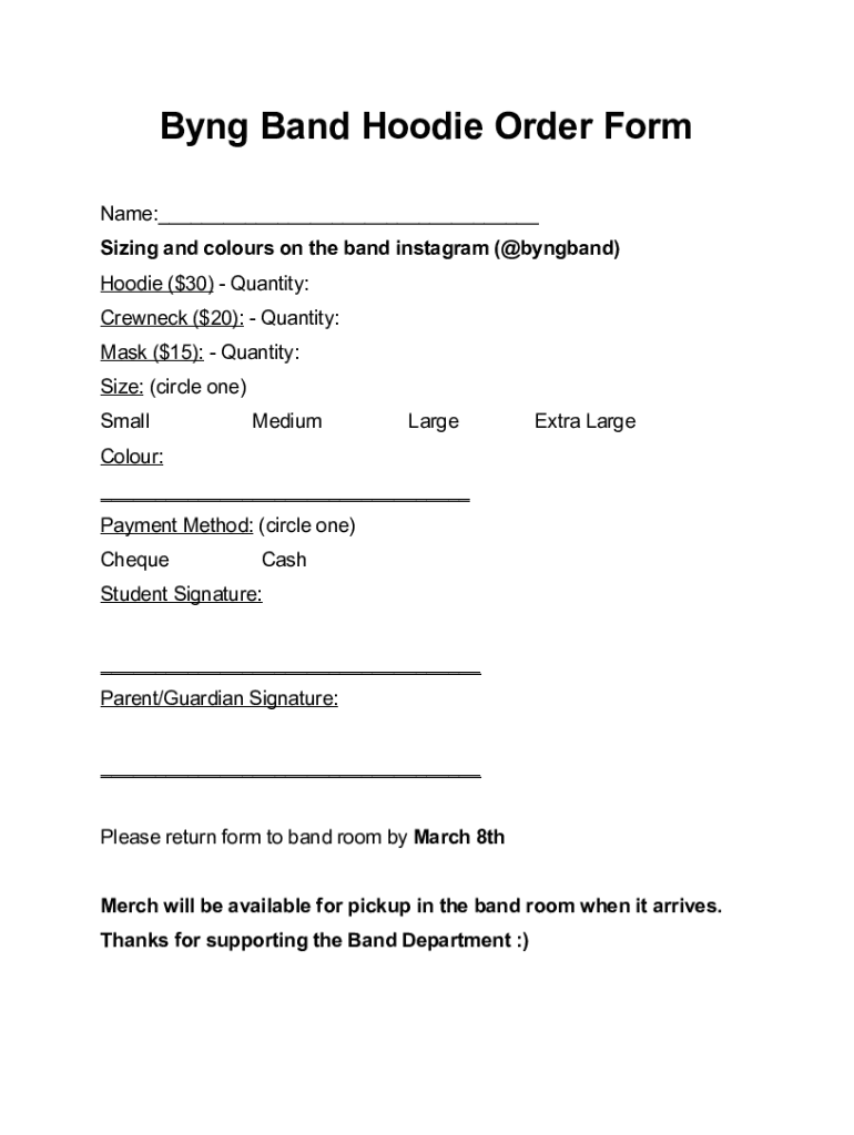To fill out Byng band hoodies, you may need to provide information about the purchase, receipt, and use of the merchandise.