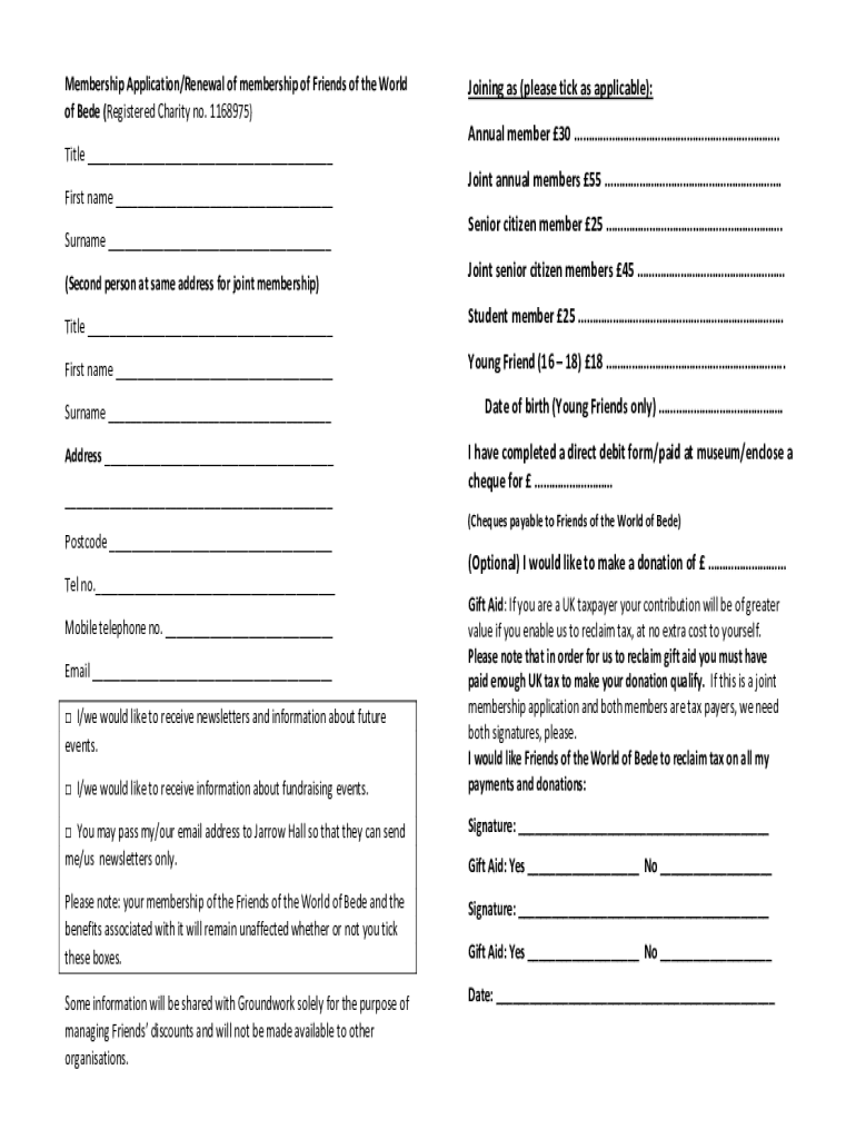 Membership Application/Renewal of membership of Friends of the World of Bede (Registered Charity no. 1168975) Title First name Surname (Second person at same address for joint membership)Joining as