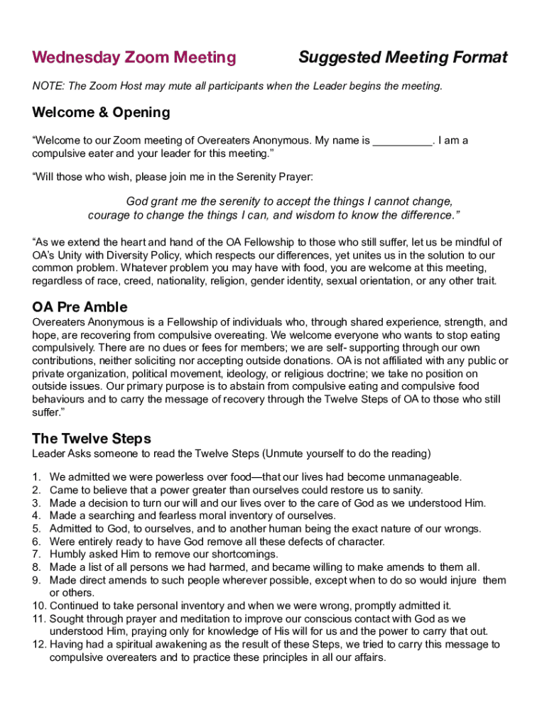 Wednesday Zoom MeetingSuggested Meeting Formation: The Zoom Host may mute all participants when the Leader begins the meeting. Welcome & Opening Welcome to our Zoom meeting of Over eaters Anonymous.