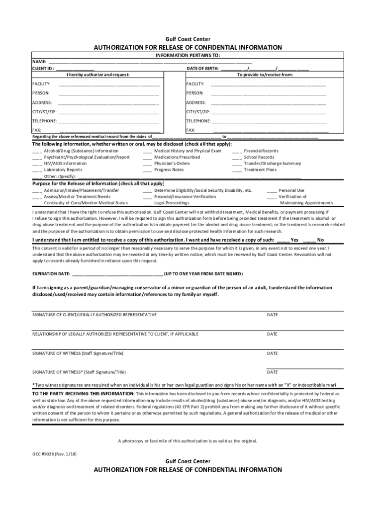 Gulf Coast CenterAUTHORIZATION FOR RELEASE OF CONFIDENTIAL INFORMATION PERTAINS TO: NAME: CLIENT ID : DATE OF BIRTH: / / I hereby authorize and request: To provide to/receive from: FACILITY: FACILITY: