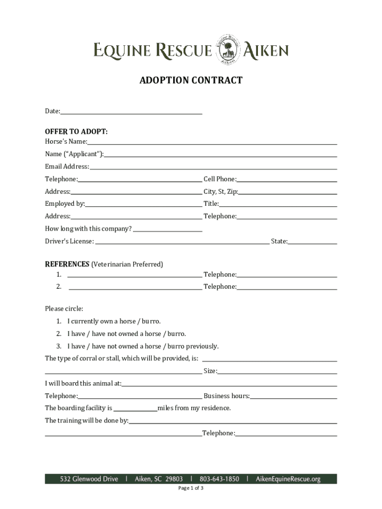 ADOPTION CONTRACT Date:OFFER TO ADOPT: Horses Name: Name (Applicant): Email Address: Telephone:Cell Phone:Address:City, St, Zip:Employed by:Title:Address:Telephone:How long with this company? Driver's
