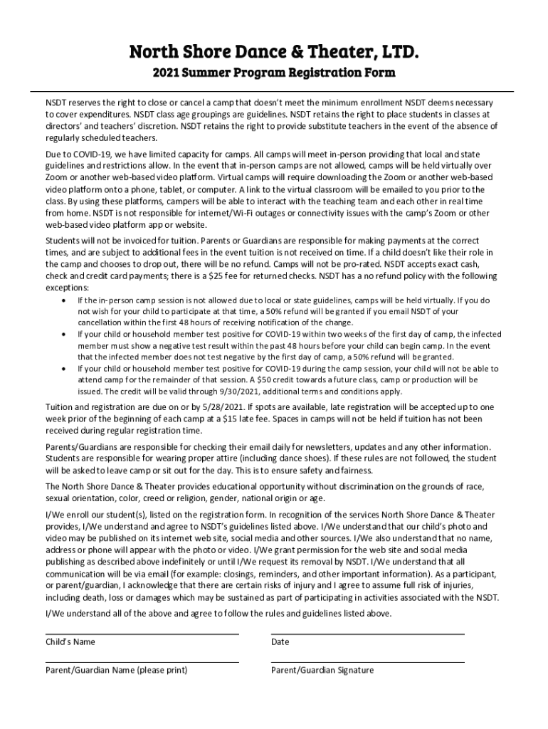 North Shore Dance & Theater, LTD. 2021 Summer Program Registration Form NDT reserves the right to close or cancel a camp that doesn't meet the minimum enrollment NDT deems necessary to cover expenditures.