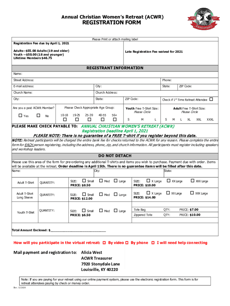 Annual Christian Women's Retreat (ACR)REGISTRATION FORM Please Print or attach mailing labelRegistration Fee due by April 1, 2021 Adults$55.00 Adults (19 and older) Youth $50.00 (18 and younger) Lifetime