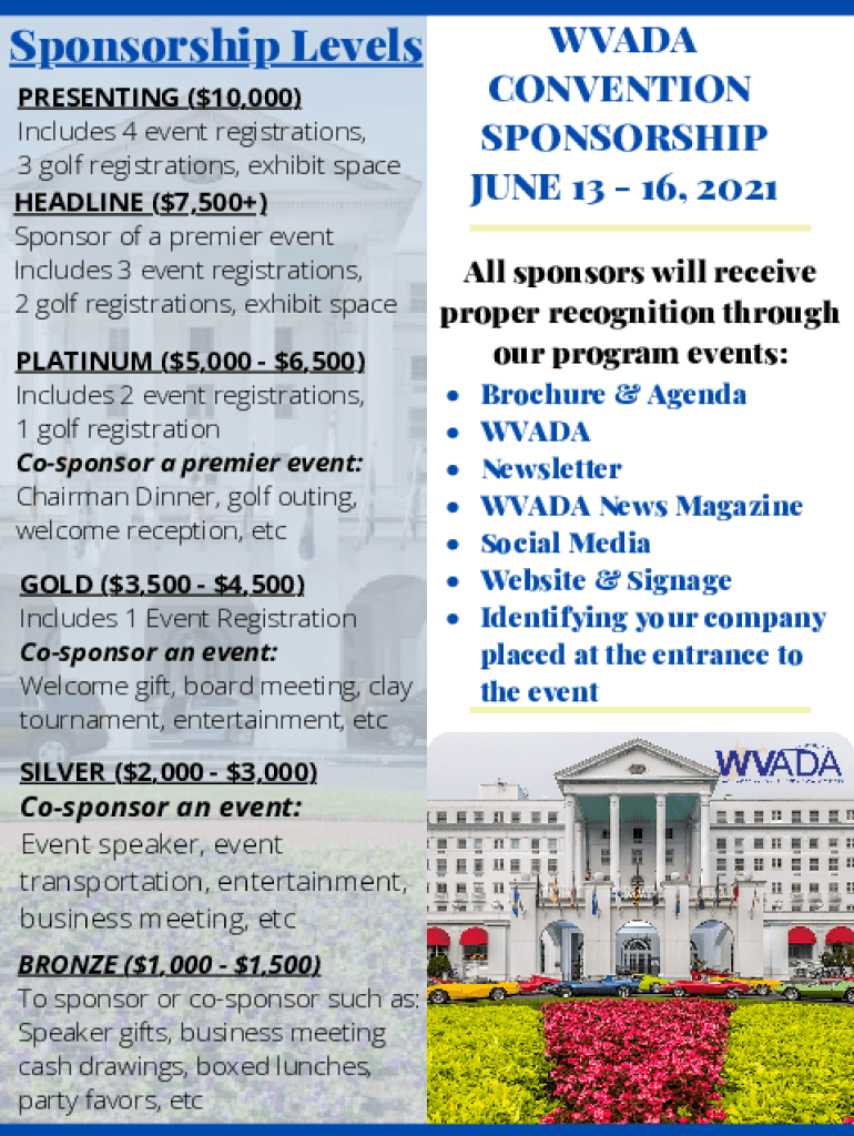 Sponsorship Levels PRESENTING ($10,000) Includes 4 event registrations, 3 golf registrations, exhibit space HEADLINE ($7,500+) Sponsor of a premier event Includes 3 event registrations, 2 golf registrations,