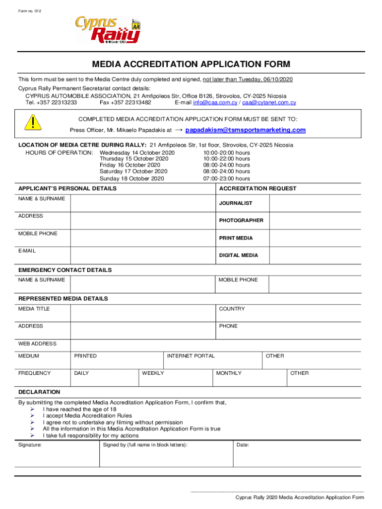 Form no. 012MEDIA ACCREDITATION APPLICATION From This form must be sent to the Media Center duly completed and signed, not later than Tuesday, 06/10/2020 Cyprus Rally Permanent Secretariat contact
