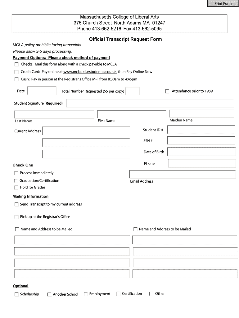 Understanding the payment methods for the MCLA Official Transcript Request Form is vital. Students can choose from several convenient payment options, which include checks, credit cards, and cash.