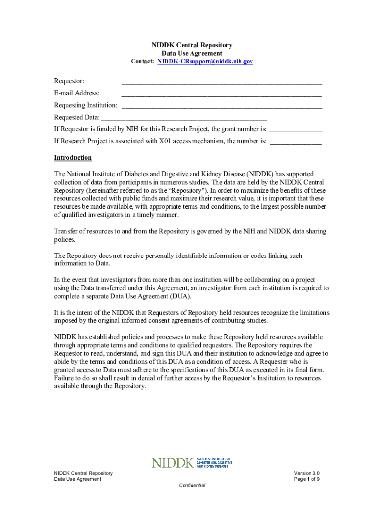 The NIDDK Data Use Agreement is required by individuals or organizations who wish to access and use data provided by the National Institute of Diabetes and Digestive and Kidney Diseases (NIDDK).