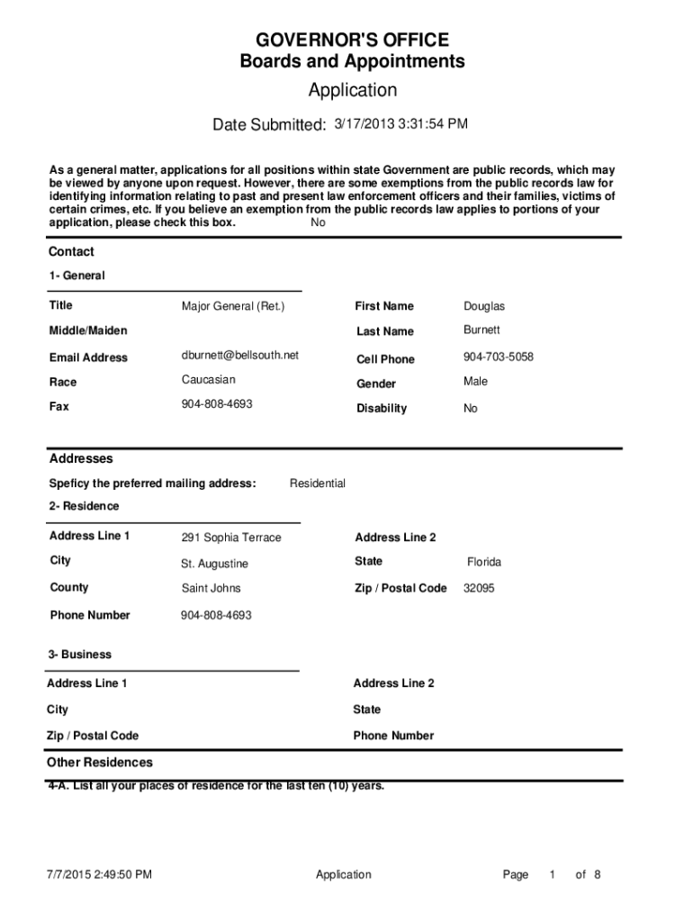 GOVERNOR\'S OFFICE Boards and Appointments Application Date Submitted: 3/17/2013 3:31:54 PM As a general matter, applications for all positions within state Government are public records, which may