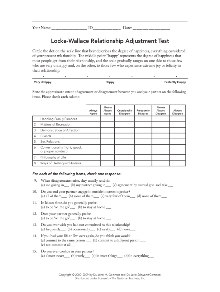 Your Name: ID Date: Locke Wallace Relationship Adjustment Test Circle the dot on the scale line that best describes the degree of happiness, everything considered, of your present relationship. The