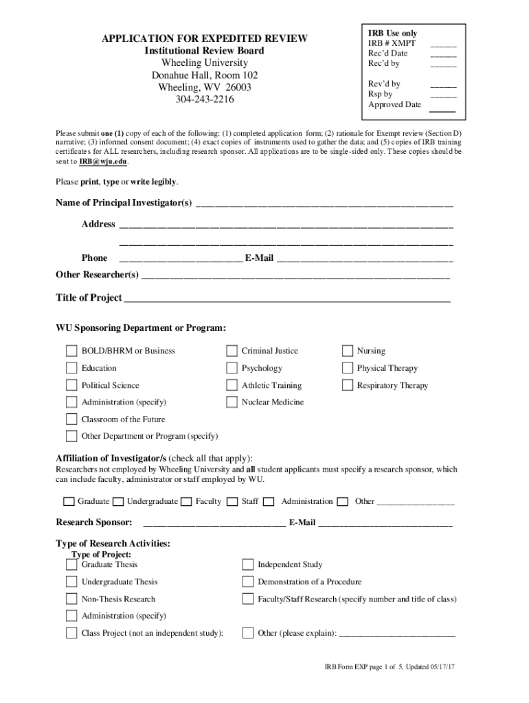 IRB Use only IRB # LMPT Recd Date Recd application FOR EXPEDITED REVIEW Institutional Review Board Wheeling University Donahue Hall, Room 102 Wheeling, WV 26003 3042432216Revd by RSP by Approved Date