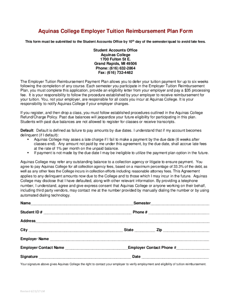 Aquinas College Employer Tuition Reimbursement Plan Form This form must be submitted to the Student Accounts Office by 10th day of the semester/quad to avoid late fees. Student Accounts Office Aquinas