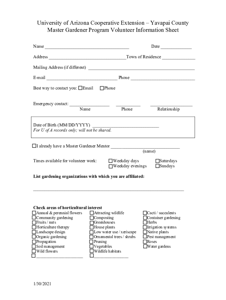 To fill out the Yavapai County Master Gardener forms, individuals must provide detailed information about their gardening activities and volunteer work.