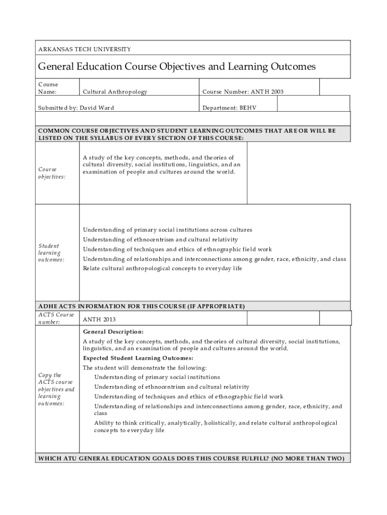ARKANSAS TECH UNIVERSITYGeneral Education Course Objectives and Learning Outcomes Course Name:Cultural AnthropologySubmitted by: David Warehouse Number: ANTI 2003 Department: BEHVCOMMON COURSE OBJECTIVES