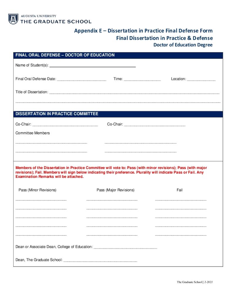 Appendix E Dissertation in Practice Final Defense Form Final Dissertation in Practice & Defense Doctor of Education Degree FINAL ORAL DEFENSE DOCTOR OF EDUCATION Name of Student(s):Final Oral Defense