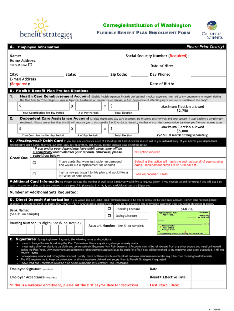 Carnegie Institution of Washington FLEXIBLE BENEFIT PLAN ENROLLMENT FORM A. Please Print Clearly! Employee Informational: Home Address: Check if New: Social Security Number (Required):Date of Hire:City: